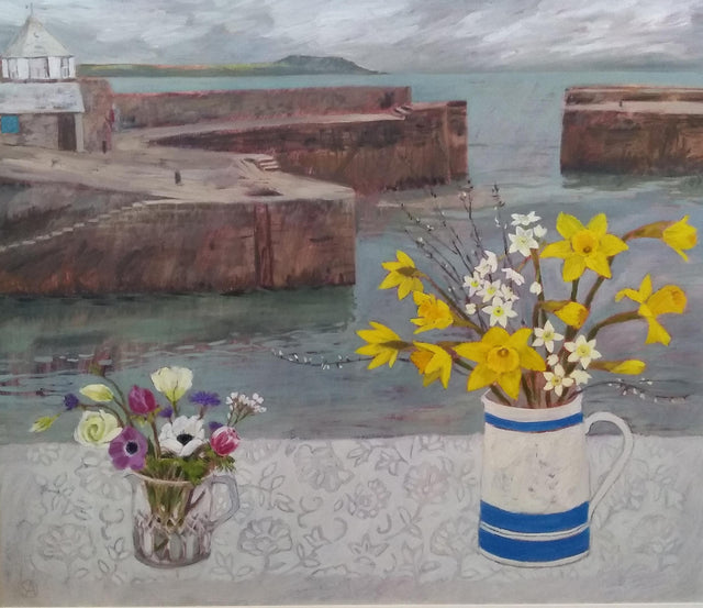 "Charlestown Harbour" is a lovely acrylic painting of a vase of daffodils in the window with a beautiful view of the historic harbour of Charlestown by Cornish artist Stephanie Axtell.