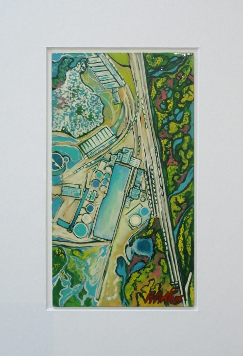 "Kaolin Refinery, Rocks Driers" an original painting by Charlestown artist Alan Arthurs based on an aerial view of the clay mines around St. Austell in Cornwall.