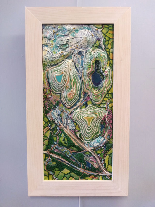 "China Clay Mines II, St. Austell" is an original 3D mixed media painting by Alan Arthurs. Taking an ariel view of the clay mining landscape in the St Austell area of Cornwall it depicts the clay tips, railway lines and clay dries and is a fascinating piece which would be of particular interest to people who love maps and industrial heritage.