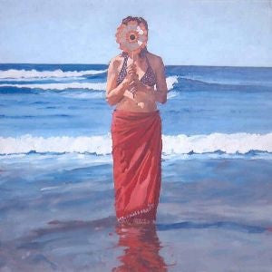 "Flower Power" is a signed and numbered limited edition of 150 giclee prints by Cornish artist David Axtell of a girl on a beach holding a large flower.