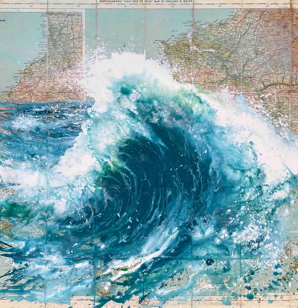 His paintings explore the wild and untamed nature of the Cornish landscape. Experimentation and expression are key aspects of his work, creating unpredictable, unique and atmospheric pieces. Combinations of mixed media including acrylic, oil and ink encourage him to push the technical boundaries of traditional landscape painting. Authentic vintage maps and other found objects are often used as the base for his art, creating a rare unique canvas for each painting and adding further to a sense of place within the work.
