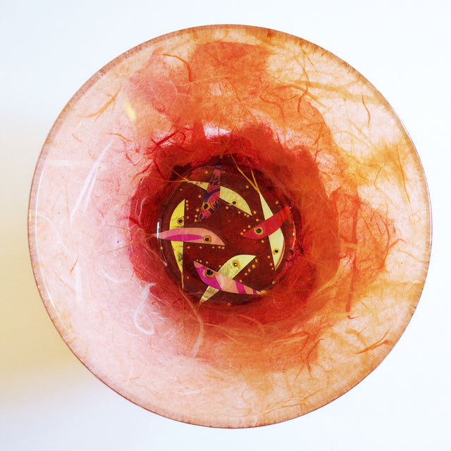 Margaret Johnson decorates glassware with straw-silk and precious metals. This "Shoal of Fish" bowl is decorated with a shoal of pink and gold fish on a salmon pink straw-silk background. Margaret works from her studio in Exeter, Devon.