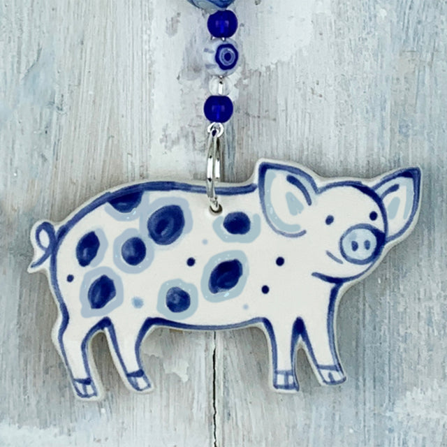 Handmade blue pig ceramic decoration is backordered and will ship as soon as it is back in stock.