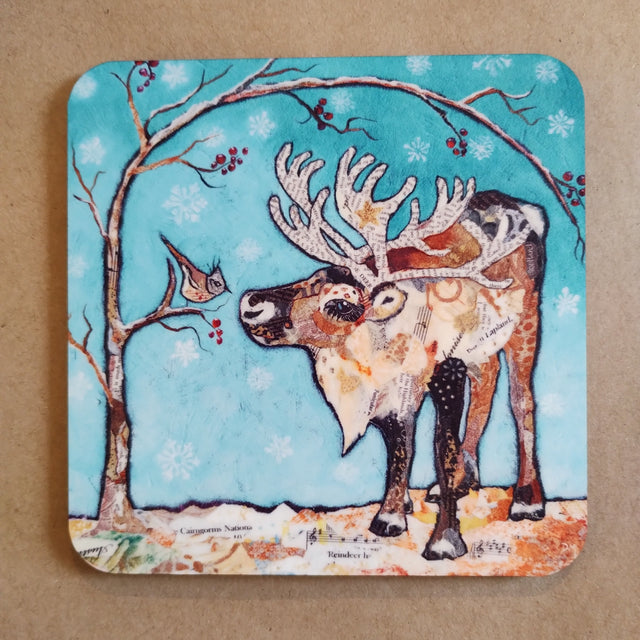 Single coaster with a reindeer and bird design by Dawn Maciocia.