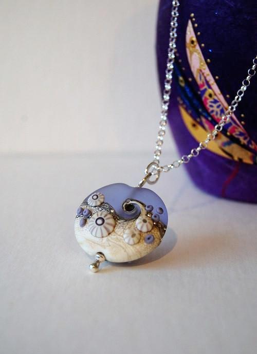 Handmade by Julie Fountain using the lampwork technique, this beautiful pendant is decorated on both sides.The tiny dots are 99% fine silver melted into the glass bead.The pendant comes on an 18" sterling silver chain. As each is hand made the design will vary slightly with each necklace.