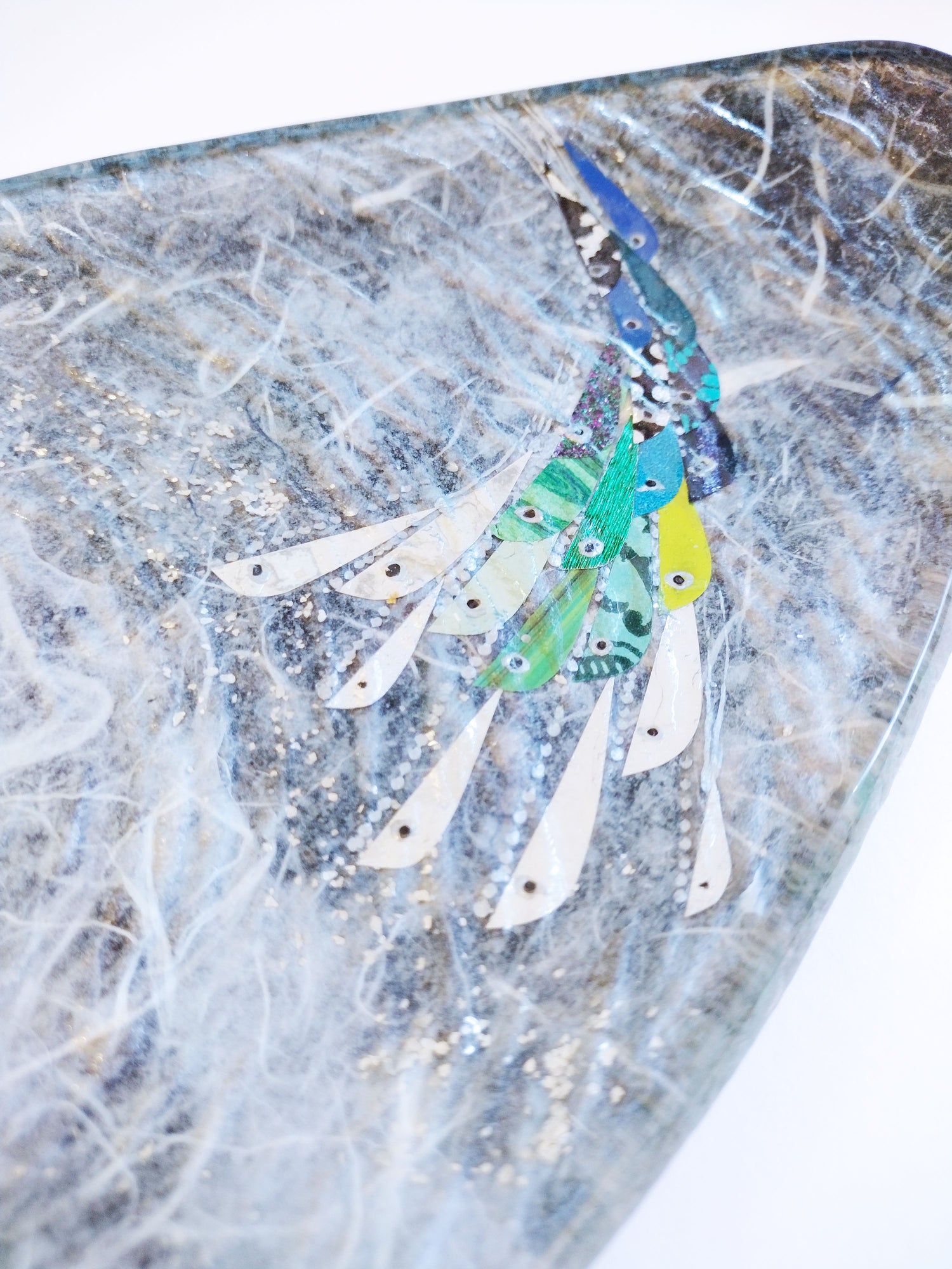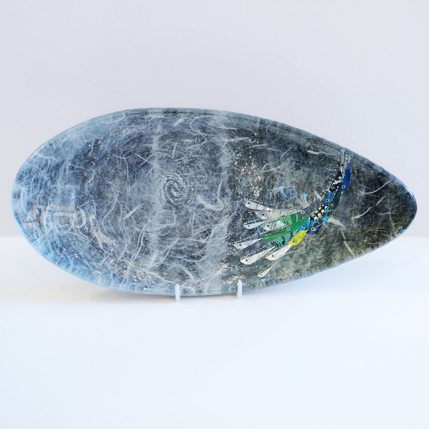 Margaret Johnson decorates glassware with straw-silk and precious metals. This sea platter is decorated with a shoal of fish.  Margaret works from her studio on the banks of the river in Exeter, Devon.