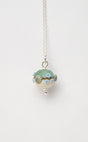 Handmade by Julie Fountain using the lampwork technique, this beautiful pendant is part of the new Beach Babe range with a lentil shaped bead on a 16″ sterling silver trace chain, finished with a branded and hallmarked tag. Each bead is decorated on both sides.The tiny dots are 99% fine silver melted into the glass bead.