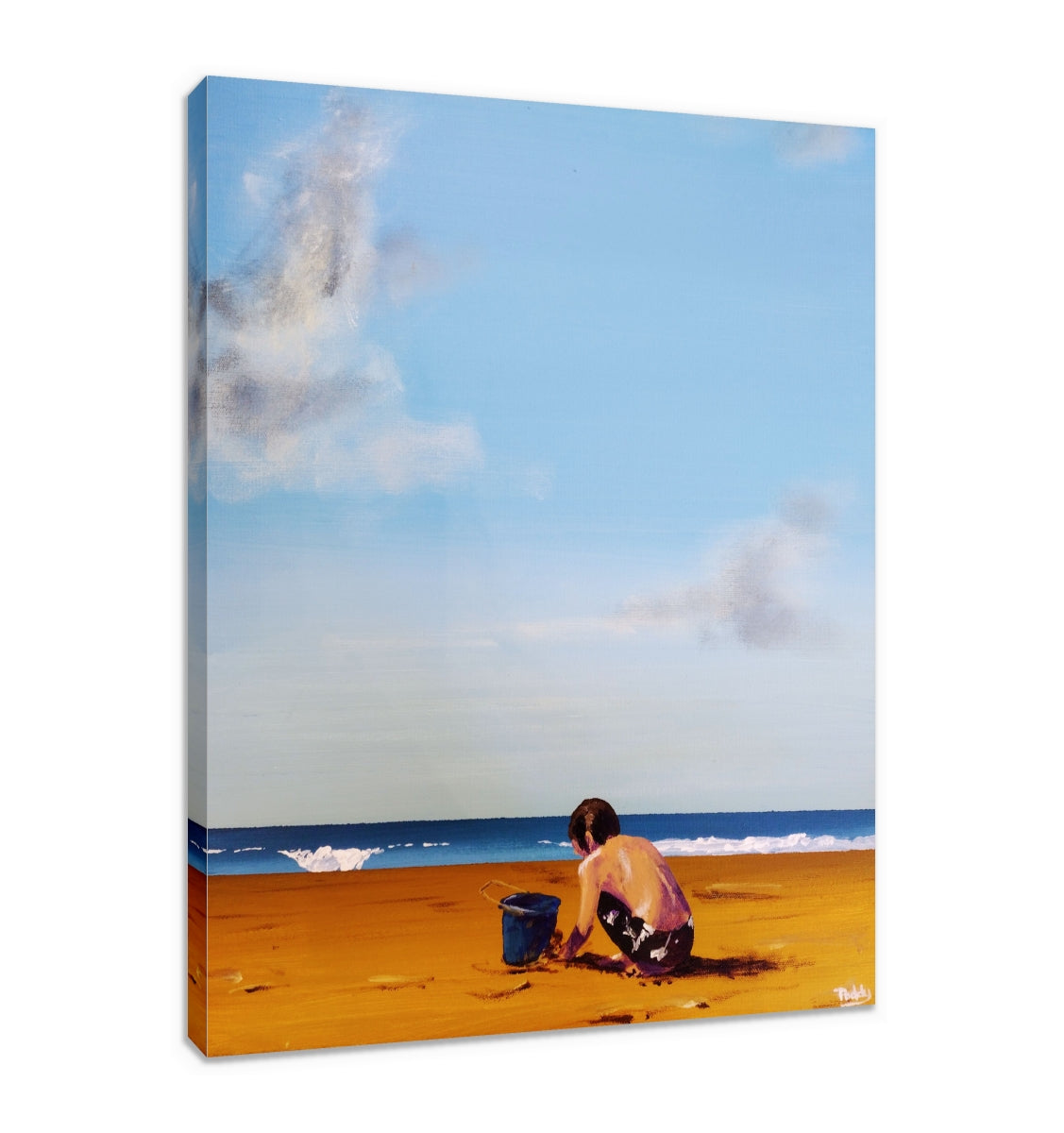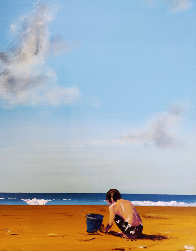 An original painting of a boy building a sandcastle painted in acrylic on canvas by artist Paddy Martin.