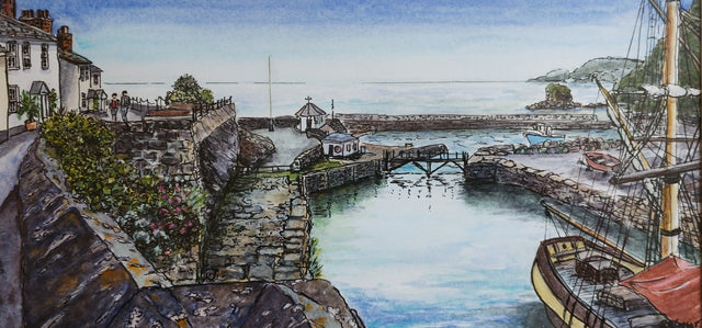 Original pen and watercolour painting by Cornwall based artist Susan Cooper, of Charlestown Harbour in Cornwall.