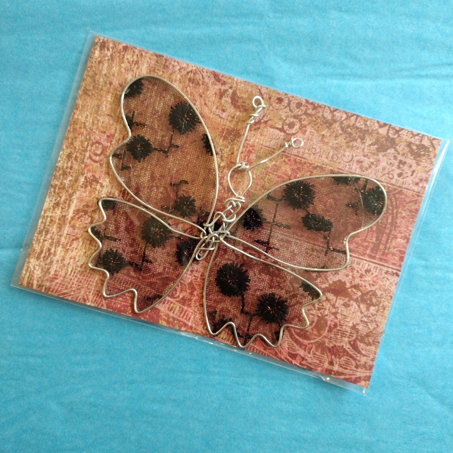 Handmade wire and fabric decorative hanging butterfly by Karen Williams.