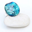 Beautiful, chunky handmade ice blue dichroic glass ring on an adjustable sterling silver ring band.