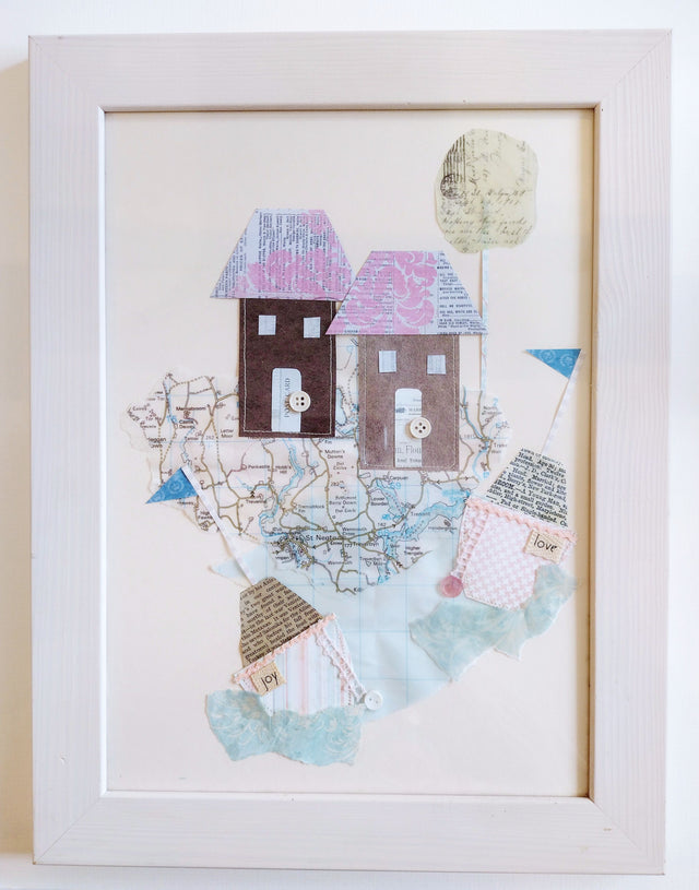 This lovely little collage by Linda Evans is made up of fabrics, old maps and paper and includes a little section of the ordinance survey map of Cornwall.