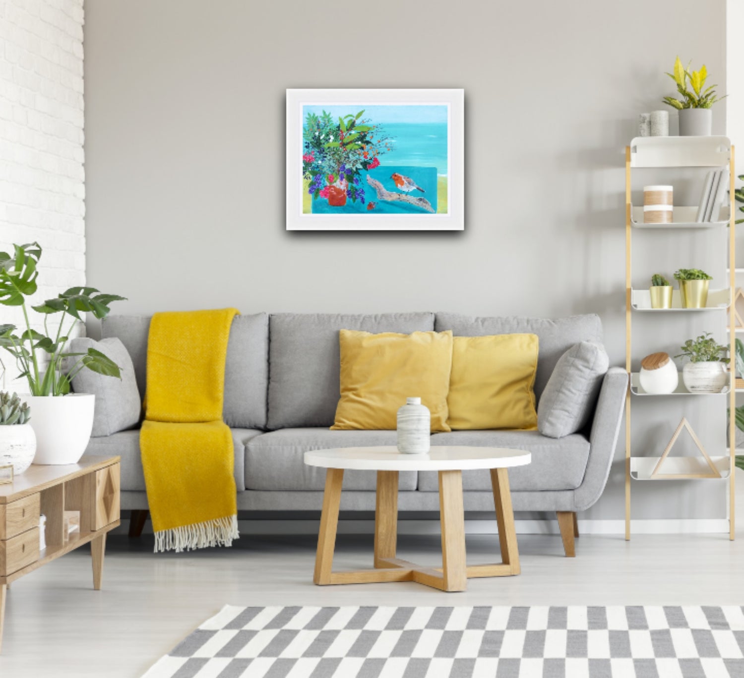 We love this painting of a robin sitting on a piece of driftwood next to a beautiful display of flowers, painted in acrylic onto recycled wood. It would look beautiful in any coastal home or country cottage. It is framed in the very popular "St. Ives" style frame, unglazed.