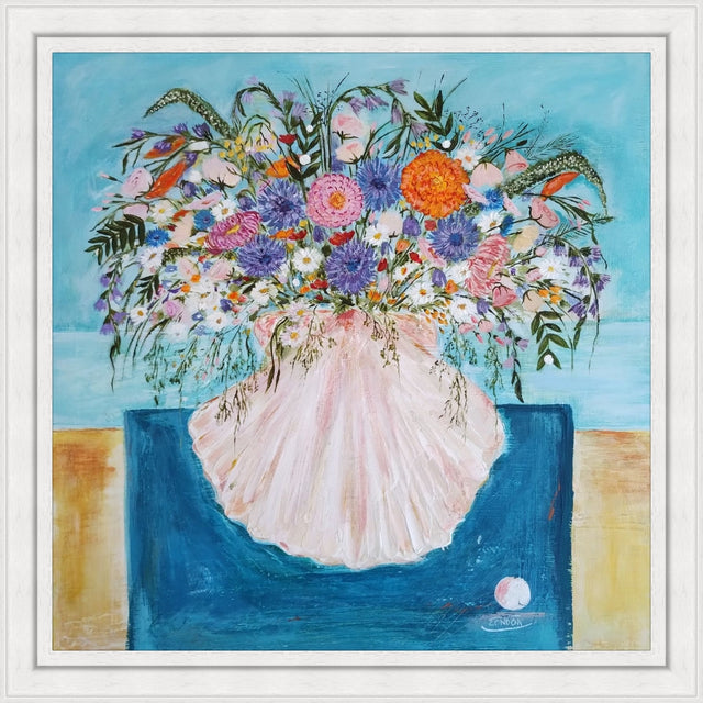 We love this painting of a a posy of flowers in a shell vase, painted in acrylic onto recycled wood. It would look beautiful in any coastal home or country cottage. It is framed in the very popular "St. Ives" style frame, unglazed.