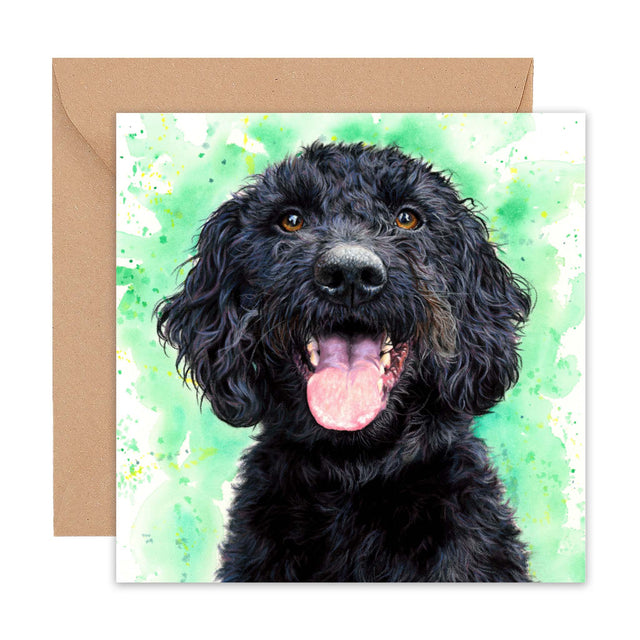 A joyful Labradoodle greeting card featuring an irresistibly cheeky grin—guaranteed to brighten anyone’s day! Perfect for sending a smile to a dog-loving friend or family member. Printed in the UK on FSC certified card. Blank inside for your own message.